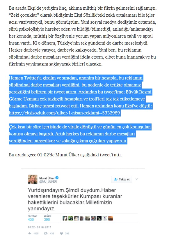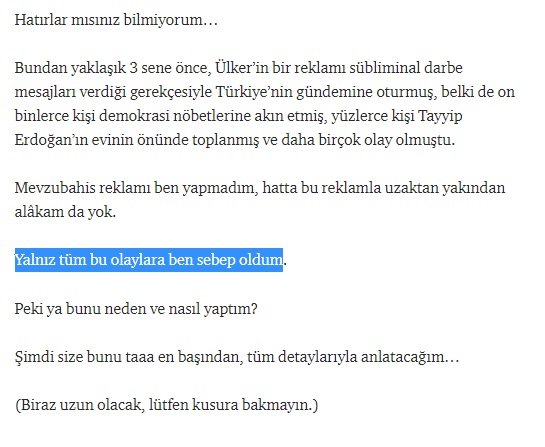 Bu arada Ekşi’de yediğim linç, aklıma müthiş bir fikrin gelmesini sağlamıştı. “Zeki çocuklar” olarak bildiğimiz Ekşi Sözlük’teki zekâ ortalaması bile içler acısı vaziyetteydi, bunu görmüştüm. Yani sosyal medya dediğimiz ortamda, sürü psikolojisiyle hareket eden ve bildiği/bilmediği, anladığı/anlamadığı her konuda, müthiş bir özgüvenle yorum yapan milyonlarca cahil ve aptal insan vardı. Ki o dönem, Türkiye’nin tek gündemi de darbe meselesiydi. Herkes darbeyle yatıyor, darbeyle kalkıyordu. Yani ben, bu reklamın sübliminal darbe mesajları verdiğini iddia etsem, elbet buna inanacak ve bu fikrimin yayılmasını sağlayacak birileri olacaktı.