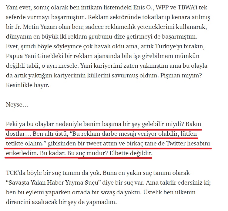 Yani evet, sonuç olarak ben intikam listemdeki Enis O., WPP ve TBWA’i tek seferde vurmayı başarmıştım. Reklam sektöründe tokatlanıp kenara atılmış bir Jr. Metin Yazarı olan ben; sadece reklamcılık yeteneklerimi kullanarak, dünyanın en büyük iki reklam grubunu dize getirmeyi de başarmıştım. Evet, şimdi böyle söyleyince çok havalı oldu ama, artık Türkiye’yi bırakın, Papua Yeni Gine’deki bir reklam ajansında bile işe girebilmem mümkün değildi tabii, o ayrı mesele. Yani kariyerimi zaten yakmıştım ama bu olayla da artık yaktığım kariyerimin küllerini savurmuş oldum. Pişman mıyım? Kesinlikle hayır.