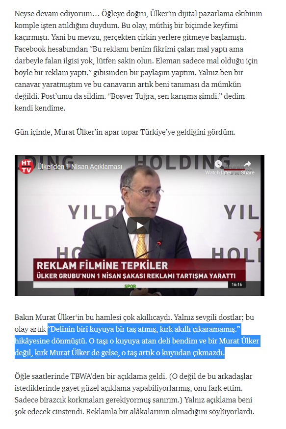 Neyse devam ediyorum… Öğleye doğru, Ülker’in dijital pazarlama ekibinin komple işten atıldığını duydum. Bu olay, müthiş bir biçimde keyfimi kaçırmıştı. Yani bu mevzu, gerçekten çirkin yerlere gitmeye başlamıştı. Facebook hesabımdan “Bu reklamı benim fikrimi çalan mal yaptı ama darbeyle falan ilgisi yok, lütfen sakin olun. Eleman sadece mal olduğu için böyle bir reklam yaptı.” gibisinden bir paylaşım yaptım. Yalnız ben bir canavar yaratmıştım ve bu canavarın artık beni tanıması da mümkün değildi. Post’umu da sildim. “Boşver Tuğra, sen karışma şimdi.” dedim kendi kendime.
