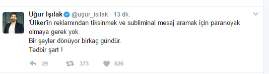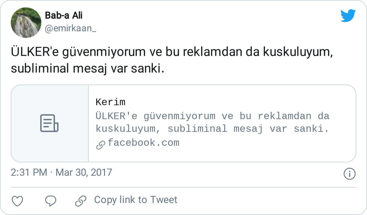 Ancak, Tuğra Yazbahar’ın aktarımının aksine, iddia ettiği zamanlama öncesinde Ülker’in reklamına tepki gösteren paylaşımları (aradan geçen zamana rağmen) görmek mümkün. “Ülker’e güvenmiyorum ve bu reklamdan da kuşkuluyum, subliminal mesaj var sanki.” gibi söylemleri içeren sosyal medya paylaşımlarına Yazbahar’ın iddia ettiği tarihin 2 gün öncesinde rastlayabiliyoruz.