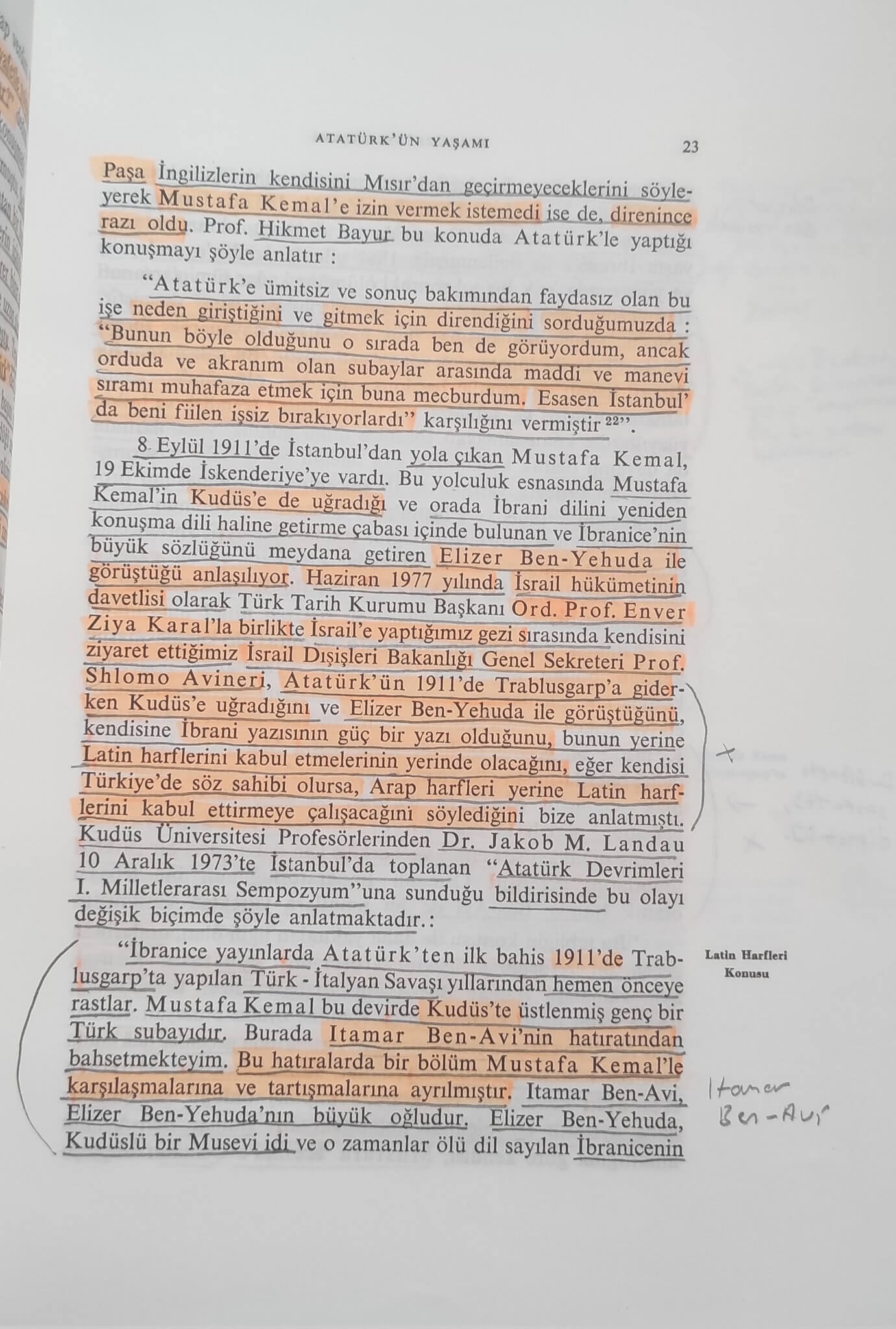 Kitabın ilgili bölümünde, Atatürk’ün 1911 yılında Trablusgarp’a doğru giderken Kudüs’te Elizer Ben-Yahuda ile görüştüğü, Elizer Ben-Yahuda’nın oğlu Kudüslü Musevi Itamar Ben-Avi’nin hatıratına değinilmektedir.