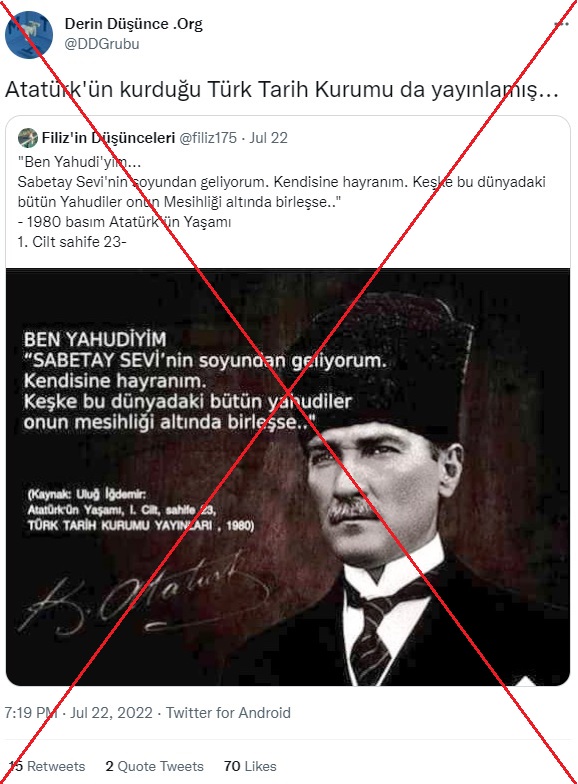 “‘Ben Yahudi’yim… Sabetay Sevi’nin soyundan geliyorum. Kendisine hayranım. Keşke bu dünyadaki bütün Yahudiler onun Mesihliği altında birleşse..” – 1980 basım Atatürk’ün Yaşamı 1. Cilt sahife 23-‘” notunu içeren sosyal medya paylaşım örneği (Filiz’in Düşünceleri ve DerinDüşünce.org adlı profiller üzerinden) şöyle sunulabilir: