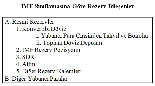IMF tasnifine göre rezervleri oluşturan bileşenler, resmi rezervler ve diğer yabancı para varlıklarıdır. Resmi rezervler ise döviz varlıkları (yabancı para cinsinden tahvil/bono, toplam döviz depoları), IMF rezerv pozisyonu, Özel Çekme Hakkı (SDR), altın ve diğer rezerv kalemlerinden oluşmaktadır (IMF Rezerv Pozisyonu, üye ülke bir kredi anlaşması kapsamında IMF’ye rezerv varlıkları aktardıysa ve/veya IMF’ye kotası gereği rezerv varlığı sağladıysa IMF’de bir rezerv pozisyonuna sahiptir. Rezerv pozisyonu, daha açık ifade edilecek olursa, IMF’nin üye ülkeden borçlanmasıdır.