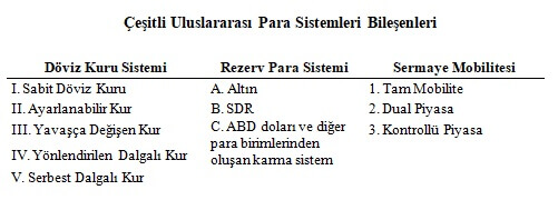 Tablonun birinci sütunu, tarihsel süreç içinde ortaya çıkan döviz kuru sistemlerini, ikinci sütun uluslararası para sistemindeki ulusal paraların konvertibl olacakları temel rezervi, üçüncü sütun ise sistemin sermaye mobilitesi esnekliğini göstermektedir. Tablonun her sütunundan bir eleman seçmek suretiyle çeşitli uluslararası para sistemleri oluşturulması mümkündür. Örneğin, Bretton Woods’da kabul edilen uluslararası altın-döviz sistemi, “II.A.3” (yani, ayarlanabilir kurlu ve altın rezervine dayalı ve sermaye hareketleri kontrollü bir para sistemi şeklinde) özetlenebilir. Benzer şekilde, altın standardı sistemini “I.A.1” (sabit döviz kuru, altın rezervine dayalı ve sermaye mobilitesi tam olan bir sistem) şeklinde gösterebiliriz (Savaş V. F. 2010. Uluslararası Para Sistemi. Siyasal Kitabevi. Ankara).