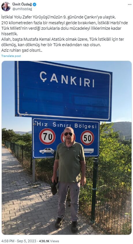 Ümit Özdağ (@umitozdag): “İstiklal Yolu Zafer Yürüyüşü’müzün 9. gününde Çankırı’ya ulaştık. 210 kilometreden fazla bir mesafeyi geride bırakırken, İstiklâl Harbi’nde Türk Milleti’nin verdiği zorluklarla dolu mücadeleyi iliklerimize kadar hissettik. Allah, başta Mustafa Kemal Atatürk olmak üzere, Türk İstiklâli için ter dökmüş, kan dökmüş her bir Türk evladından razı olsun. Aziz ruhları şad olsun!..”