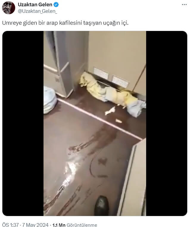 Yolcular tarafından kirletilmiş bir uçak kabininin görüntülendiği video sosyal medya platformlarında umre ibadeti için Suudi Arabistan’a giden Arap kafileyi taşıyan uçağa ait olduğu iddiasıyla kullanılıyor.