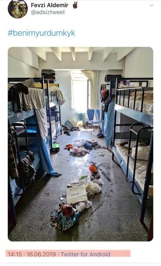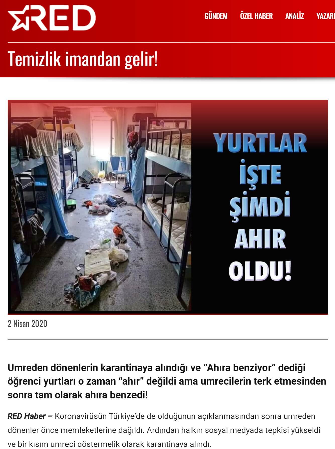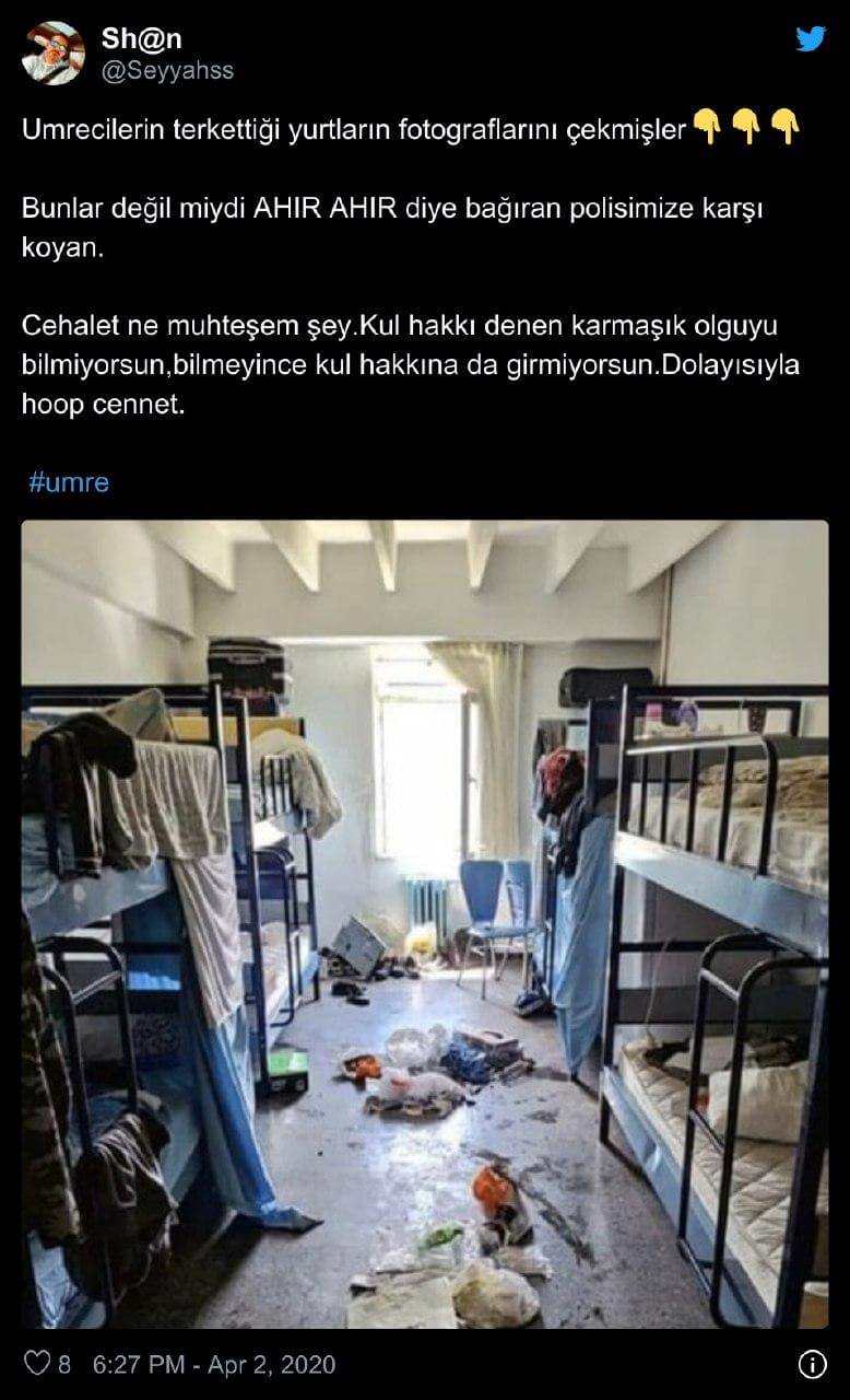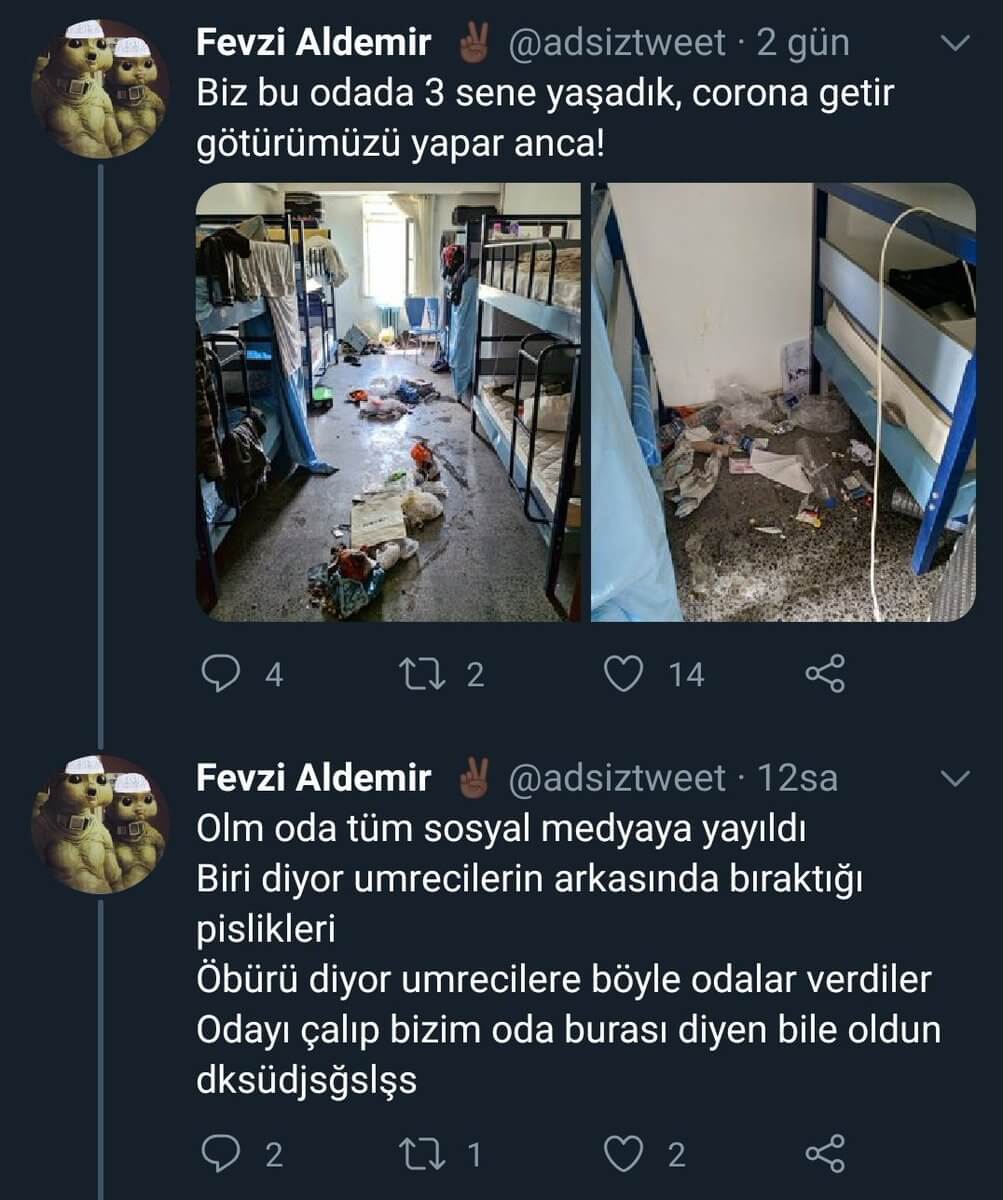 “ülkemize corona virüsünü yayıp pek çok vatandaşımızın ölmesine ve binlerce vatandaşımızın salgından etkilenmesine sebep olan umrecilerin, kaldıkları yurtlardaki karantina süreleri bittikten sonra yurtları boşaltmaları ile ortaya çıkan manzaradır. öğrencilerimizin, gençlerimizin pırıl pırıl bıraktığı yurtların umrecilerden sonraki hali;”