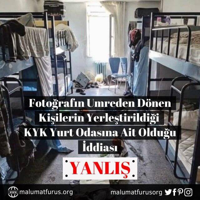İddianın aksine, paylaşılan fotoğraf umrecilerin terk ettiği KYK yurt odasına ait değil. “Umrecilerin terk ettiği öğrenci yurtları” notuyla paylaşılan fotoğraf koronavirüs salgını öncesinde 2019 yılı Haziran ayı içerisinde paylaşılmış.