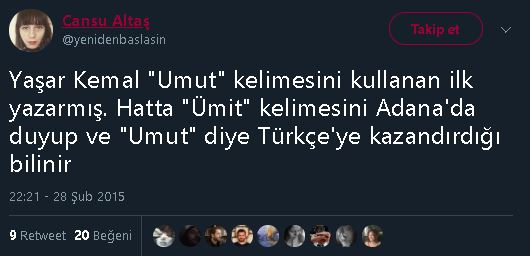 Yaşar Kemal'in "umut" kelimesini kullanan ilk yazar olduğu iddiasını içeren paylaşım