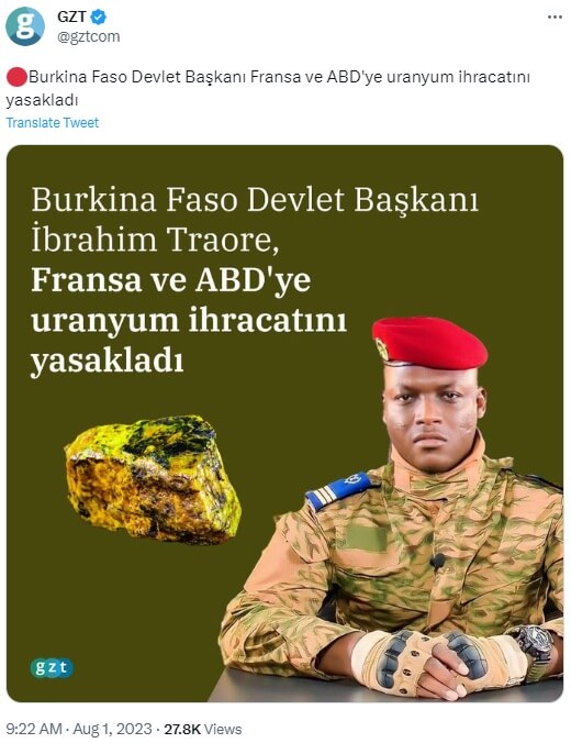 GZT (@gztcom): “🔴Burkina Faso Devlet Başkanı Fransa ve ABD’ye uranyum ihracatını yasakladı”