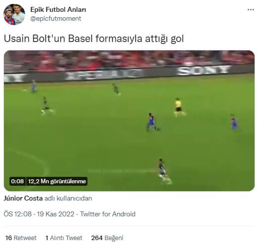 “Usain Bolt’un Basel formasıyla attığı gol” notuyla paylaşılan video, Basel ve Benfica arasında 27 Eylül 2017 günü oynanan Şampiyonlar Ligi maçında Dimitri Oberlin’in attığı gole ait.