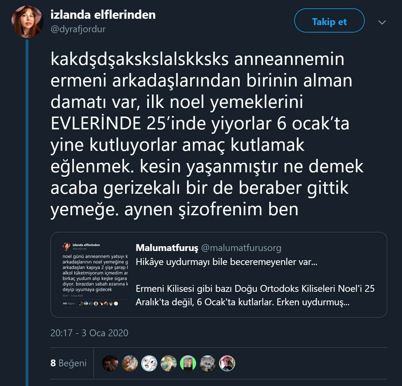 “kakdşdşakskslalskksks anneannemin ermeni arkadaşlarından birinin alman damatı var, ilk noel yemeklerini EVLERİNDE 25’inde yiyorlar 6 ocak’ta yine kutluyorlar amaç kutlamak eğlenmek. kesin yaşanmıştır ne demek acaba gerizekalı bir de beraber gittik yemeğe. aynen şizofrenim ben”