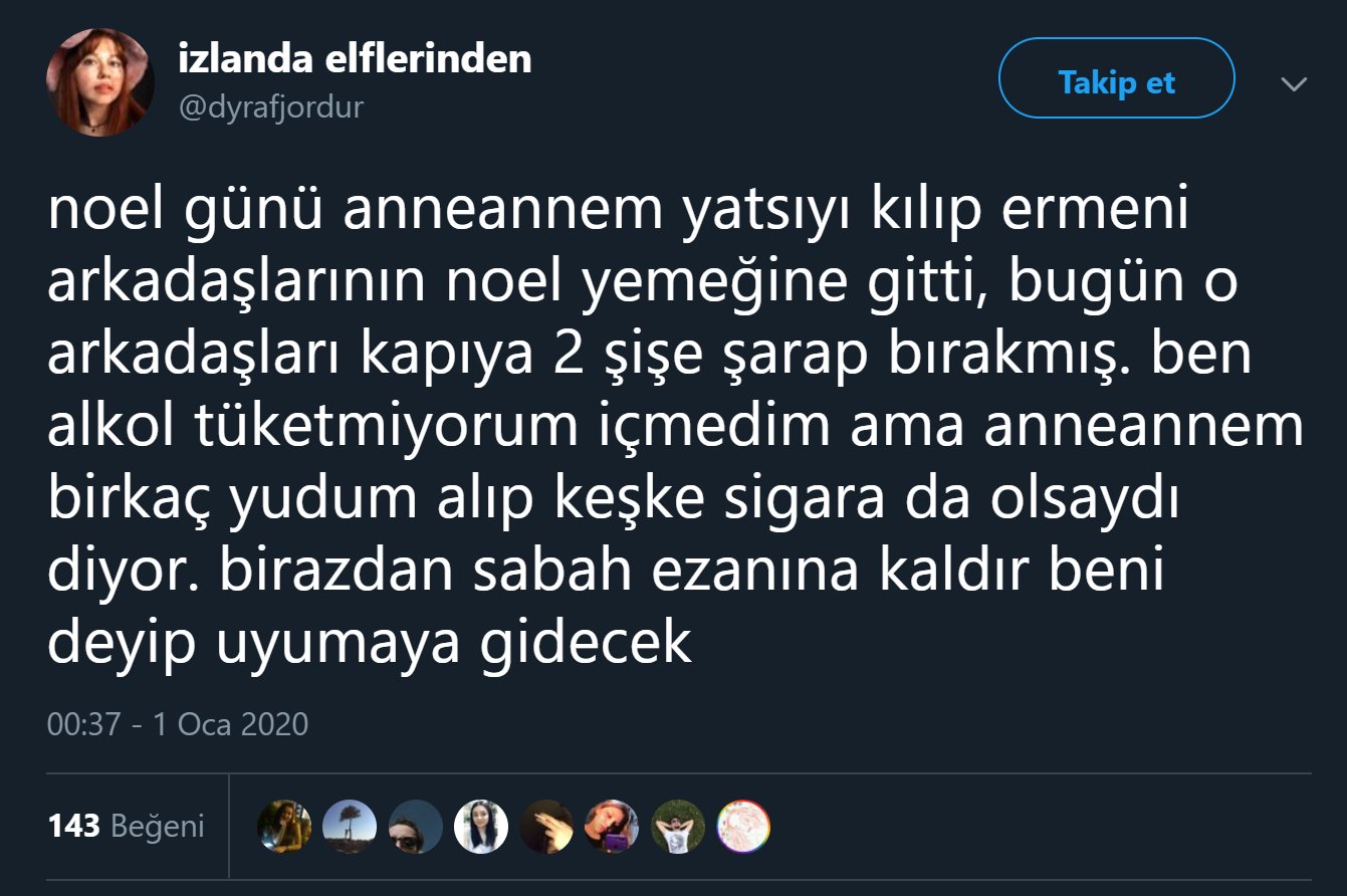 “noel günü anneannem yatsıyı kılıp ermeni arkadaşlarının noel yemeğine gitti, bugün o arkadaşları kapıya 2 şişe şarap bırakmış. ben alkol tüketmiyorum içmedim ama anneannem birkaç yudum alıp keşke sigara da olsaydı diyor. birazdan sabah ezanına kaldır beni deyip uyumaya gidecek”