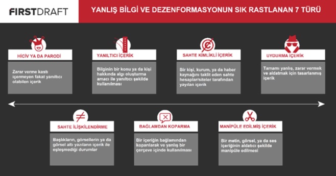 “Uydurma” kavramının bilgi düzensizliği açısından anlamını anlamak adına First Draft adlı girişimin yanlış bilgi kavramına ilişkin geliştirdiği 7’li taksonomiye (7 Categories of Information Disorder) göz atmakta fayda var (Bahse konu sınıflama hakkında ilave bilgi için First Draft’ın “First Draft’s Essential Guide to Understanding Information Disorder” adlı yayınına göz atabilirsiniz).