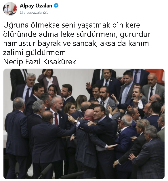 Bahsettiğimiz hatalı kullanımın bir örneğini, eski futbolcu ve AKP Milletvekili Alpay Özalan’ın attığı bir tweette görmüştük. Özalan, TBMM’de karıştığı kavganın fotoğrafı ile birlikte bu sözü “Necip Fazıl Kısakürek” imzasıyla paylaşmıştı.