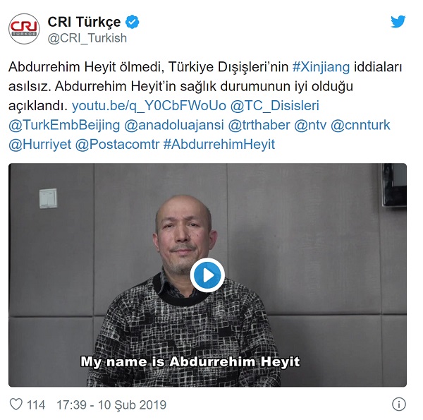 Çin Halk Cumhuriyeti Abdurehim Heyit’in ölmediğini açıklayarak iddiaları yalanlamıştı. Çin’in devlet radyosu CRI’nın Türkçe dil servisi tarafından öldüğü öne sürülen Uygur halk ozanı Abdurrehim Heyit’in ‘yaşadığının kanıtı’ vurgusuyla 25 saniyelik bir video yayımlandı. “Abdurrehim Heyit ölmedi, Türkiye Dışişleri’nin #Xinjiang iddiaları asılsız. Abdurrehim Heyit’in sağlık durumunun iyi olduğu açıklandı” notuyla paylaşılan bu video kaydında Abdurehim Heyit’in “Adım Abdurehim Heyit, bugün 10 Şubat 2019, ulusal yasaları ihlal ettiğim iddiasıyla soruşturma sürecindeyim. Şu an sağlığım iyi. Hiçbir şekilde kötü muameleye maruz kalmadım” şeklinde ifade kullandığı görülmüştür.