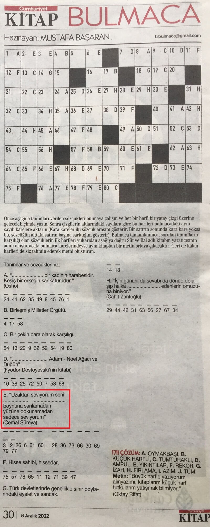 Bu şiiri Cemal Süreya’ya ait zannedenlere Cumhuriyet Kitap eki de eklenmiş, 8 Aralık 2022, sayı 1712. Bakınız: Bulmaca’nın 5. (E) sorusu. Üzülerek bildiriyorum…
