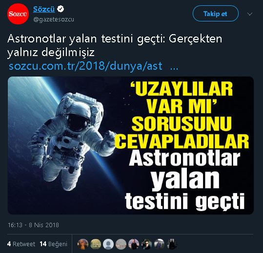 Sözcü, Habertürk, Yurt gibi birçok gazetede “Astronotlar yalan testini geçti: Gerçekten yalnız değilmişiz” başlığıyla yayınlanan haber metni şu şekilde: