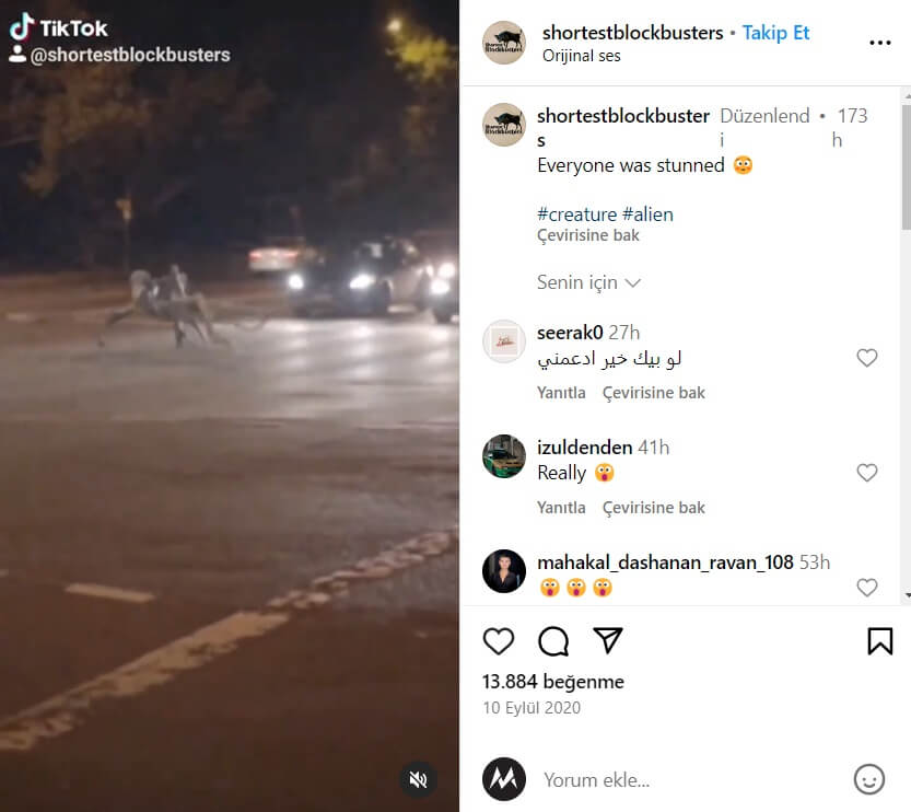 Uzaylı yaratığın otoyolda ve bahçede yürürken görüldüğü video 10 Eylül 2020 tarihinde paylaşılmış.
