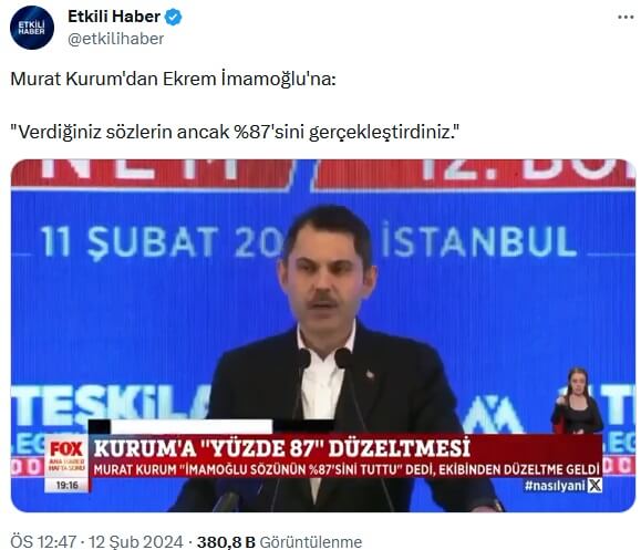 Etkili Haber, Büyükşehir Çalışıyor, Haber Report, Dark Web Haber, Muhbir, Aykırı, Solcu Gazete, Hakikat, Whisper, duvaR, T24, Haber Aktif, Medyanın 50 Tonu, Karar Haber Metropol Haber gibi birçok haber profili Murat Kurum’un sehven aktardığı “verdiğiniz sözlerin yüzde 87’sini gerçekleştirdiniz” sözünü içeren kesiti “Murat Kurum, Ekrem İmamoğlu’nu eleştirmek isterken övdü” vurgusuyla kullanırken akabinde gelen tekzibi görmezden geldi.