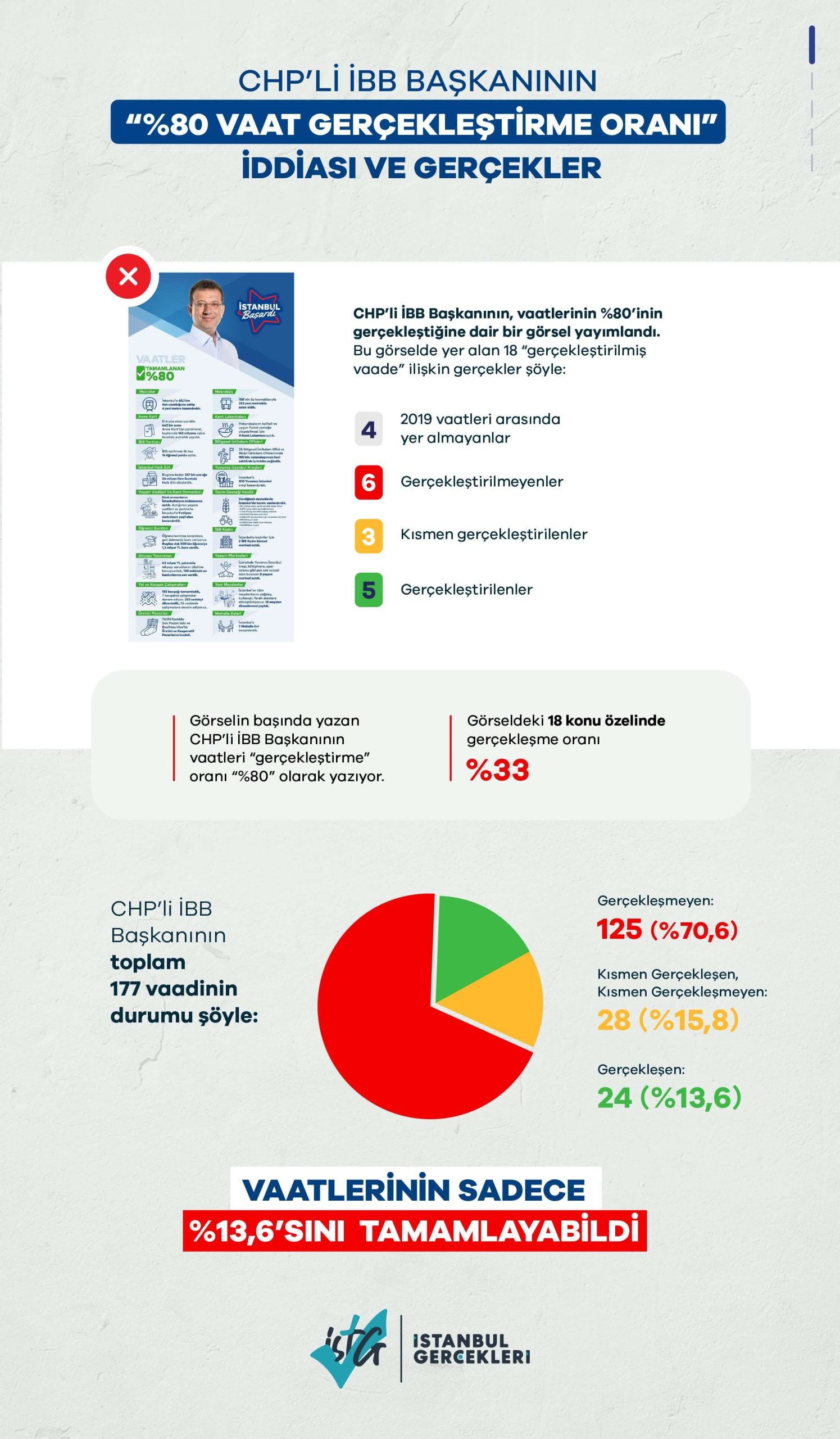 İstanbul Büyükşehir Belediye Başkanı Ekrem İmamoğlu, 2022 yılı Ağustos ayında Adalet ve Kalkınma Partisi tarafından hazırlanan İBB raporundaki “vaatlerinin ancak yüzde 5,9’unu yaptı, yüzde 83’ünü gerçekleştiremedi, yüzde 11,1’ini ise kısmen gerçekleştirdiği” iddiasına “Hayır, biz yönetime geldiğimiz günden beri vaatlerimizin yüzde 42’sini hayata geçirdik. Yüzde 30’unu kısmen gerçekleştirdik, yüzde 28’ini ise henüz yapamadık” yanıtını vermişti.