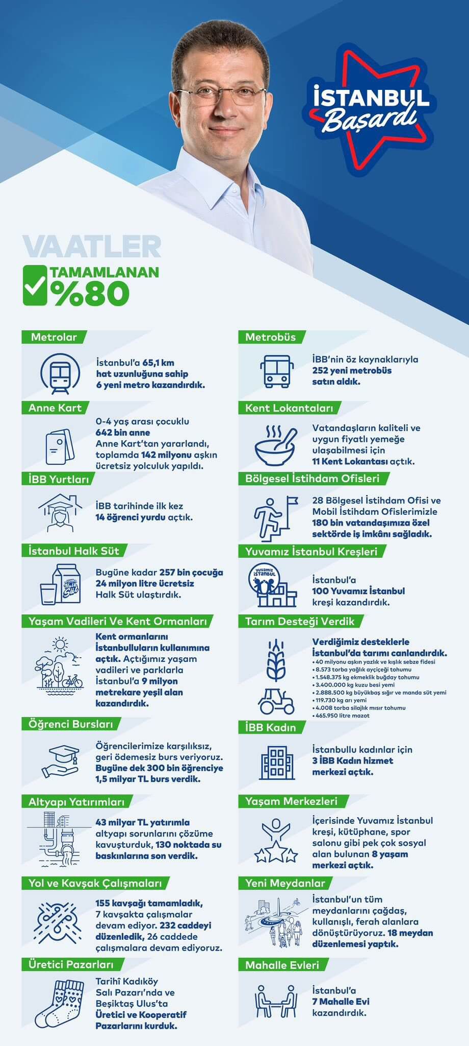 İBB Başkanı Ekrem İmamoğlu’nun seçim sloganı olan “İstanbul Başardı” adlı profil İmamoğlu’nun 23 Haziran 2019 günü yenilenen seçimi kazanmasıyla başlayan yaklaşık 5 yıllık görev süresi boyunca vaatlerinin %80’inin hayata geçirildiğini ileri süren bir afiş yayımladı.