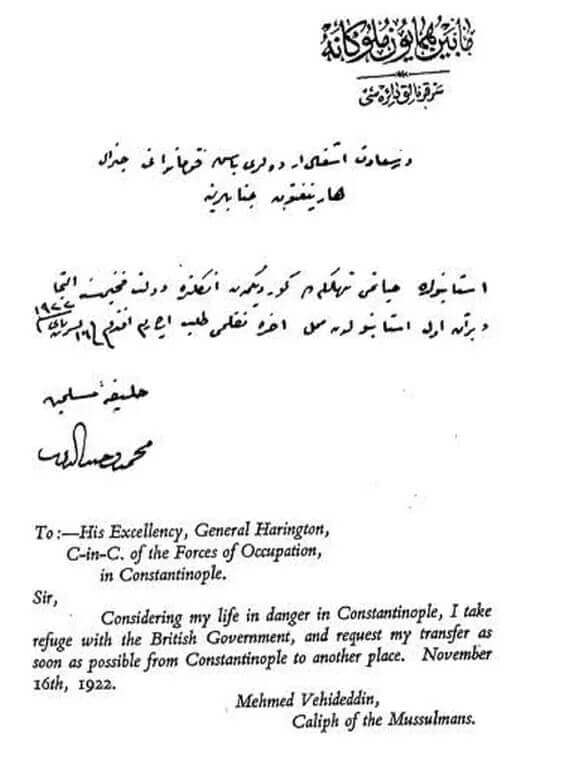 Millî Mücadele’nin kazanılmasının ardından saltanatın kaldırılmasının etkisiyle Padişah Vahdettin, İstanbul’da güvenliğinden endişe duyduğunu belirterek 16 Kasım 1922 günü İstanbul İşgal Kuvvetleri Komutanı Harington’tan bir mektupla yardım istedi.
