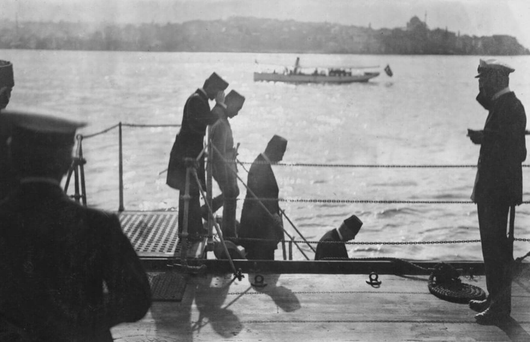 Çevredeki denizciler kendisini selamlarken Vahdettin’in İngiliz bayrağının asılı olduğu gemiye binerken görüntülendiği fotoğrafın kaynağını ve hangi arşivde yer aldığını henüz tespit edemedik.