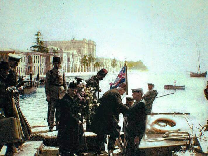 Padişah Vahdettin’in düşman gemisiyle İstanbul’u terk ettiği ana ait olduğu iddiasıyla yaygın şekilde kullanılan fotoğrafın renklendirilmiş hâli şu şekilde: