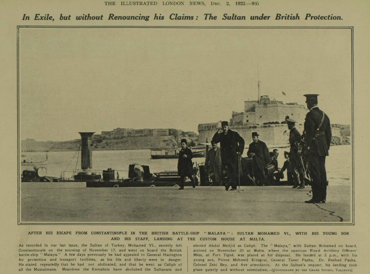 Padişah Vahdettin’in Malta’da kendisini törenle karşılayan heyeti selamladığı görülen fotoğraf da Illustrated London News’te 2 Aralık 1922 günü yayımlanmış.