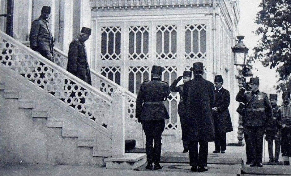 Padişah Vahdettin’in sarayın arka kapısından çıkarken selamlandığı görülen fotoğraf, İstanbul’dan ayrıldığı 17 Kasım 1922 tarihinden önce kaydedilmiş.