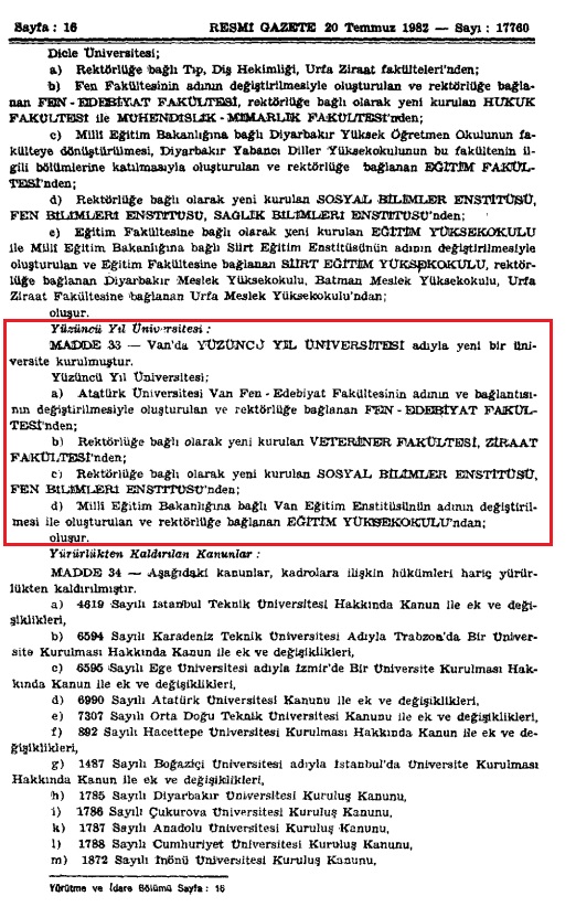 Van Yüzüncü Yıl Üniversitesi, 20 Temmuz 1982 tarihli 17760 sayılı Resmî Gazete’de yayımlanan 19 Temmuz 1982 tarihli 41 sayılı Yükseköğretim Kurumları Teşkilatı Hakkında Kanun Hükmünde Kararname ile kurulmuştur.