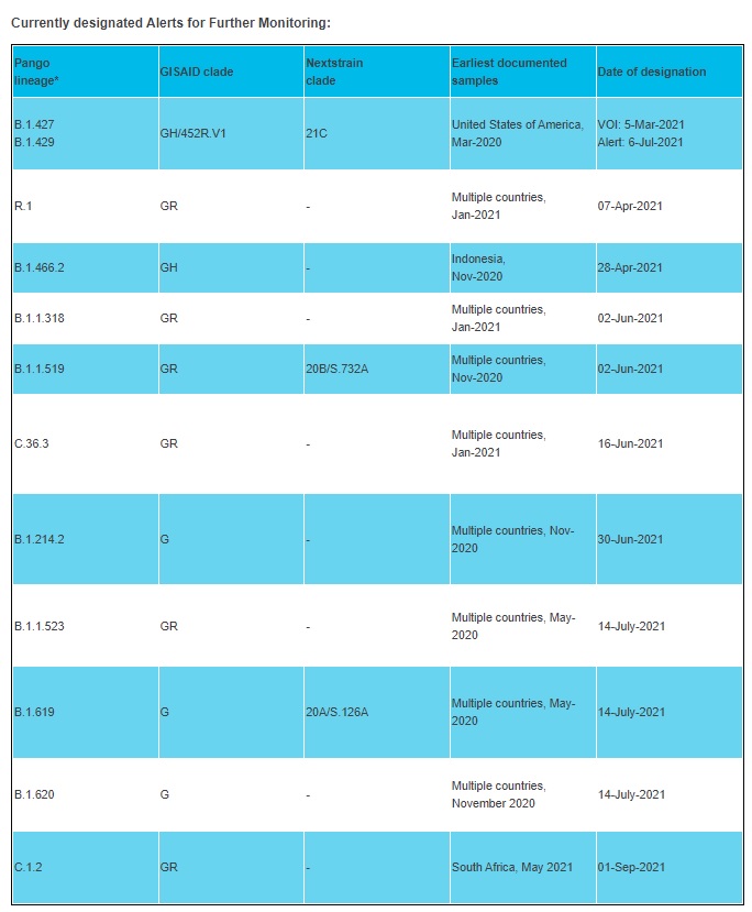 Bu sınıflamaya ilaveten, gelecekte bir riske işaret edebilecek olsa da epidemiyolojik etkisine ilişkin kanıtları net olmayan varyantlar ise “Daha Fazla İzleme İçin Uyarı” (“Alerts for Further Monitoring”) sınıfına alınarak Yunan alfabesinden harflerle değil “PANGO” (“Phylogenetic Assignment of Named Global Outbreak Lineages”) soy numaralandırma sistemine göre adlandırılmaktadır.