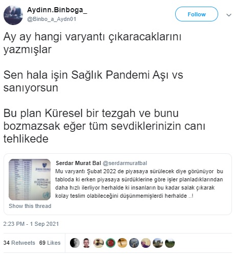 “Ay ay hangi varyantı çıkaracaklarını yazmışlar Sen hala işin Sağlık Pandemi Aşı vs sanıyorsun Bu plan Küresel bir tezgah ve bunu bozmazsak eğer tüm sevdiklerinizin canı tehlikede”