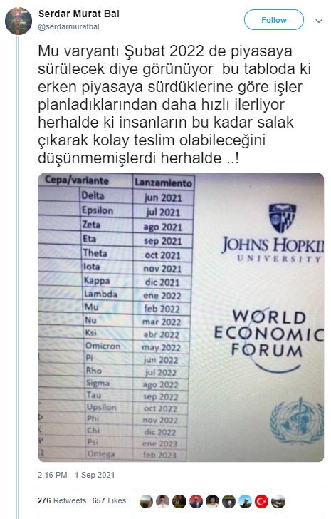 “Mu varyantı Şubat 2022 de piyasaya sürülecek diye görünüyor bu tabloda ki erken piyasaya sürdüklerine göre işler planladıklarından daha hızlı ilerliyor herhalde ki insanların bu kadar salak çıkarak kolay teslim olabileceğini düşünmemişlerdi herhalde ..!”