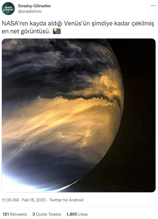 “NASA görüntüledi! Venüs ün en yakın çekim hali!” notuyla sosyal medyada paylaşılan görsel, aslında NASA ile bir ilgisi bulunmayan dijital işlemeye tabi tutulmuş bir çıktı.