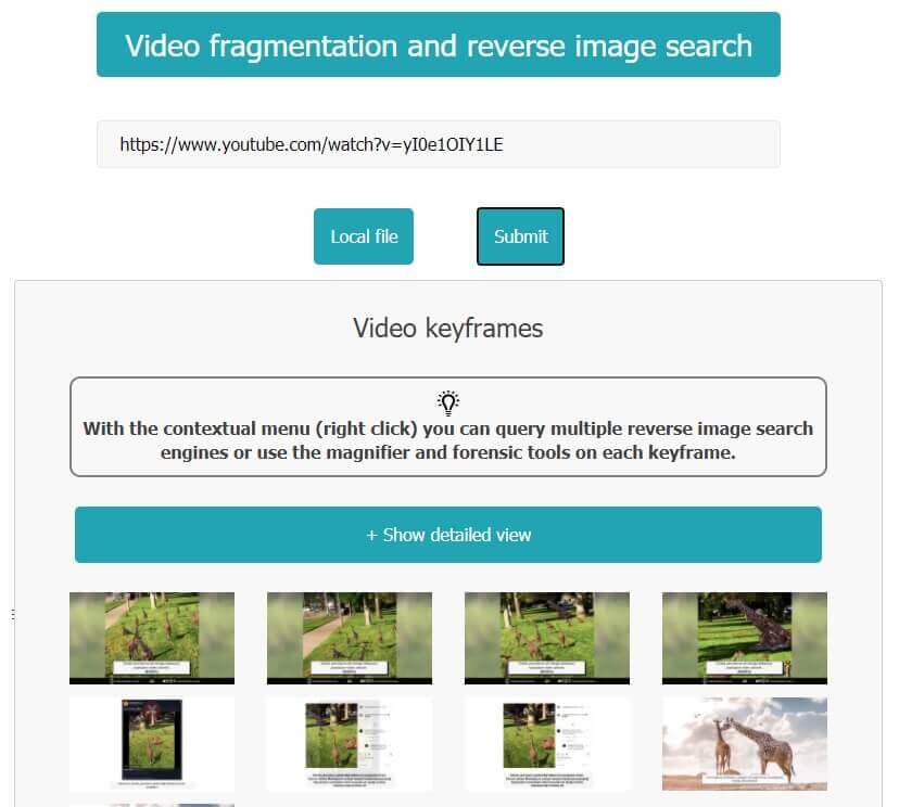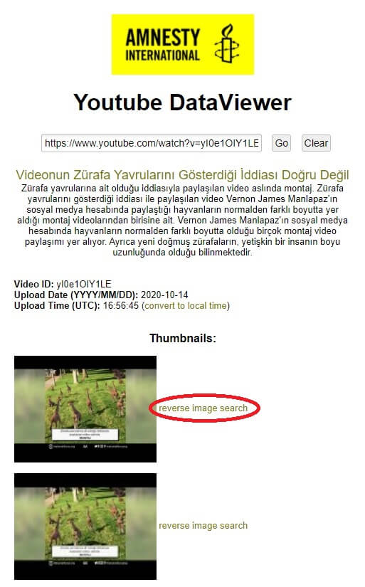 Örneğin, Malumatfuruş’un Youtube’da yayımladığı zürafa yavrularına ait olduğu iddiasıyla paylaşılan videoya dair kaydı ele alalım. İlgili bağlantıyı alıp “Enter Youtube URL” yazan bölüme yapıştırıp “Go” tuşuna tıkladığımızda, bahse konu videodan örnek resimler alıntılanacaktır. “Reverse image search” yani “tersine görsel arama” notuna tıklandığında ise doğrudan ilgili alıntı görüntünün Google Görseller üzerinde arandığı sayfaya yönlendirecektir.