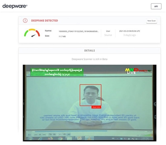 Örneğin, Askeri darbe yaşanan Myanmar’da, hapisteki Başbakan ile ilgili “suçunu itiraf etti” iddiasıyla yayınlanan videonun gerçeği yansıtmayan bir deepfake video olduğu Deepware Scanner tarafından tespit edilmişti.