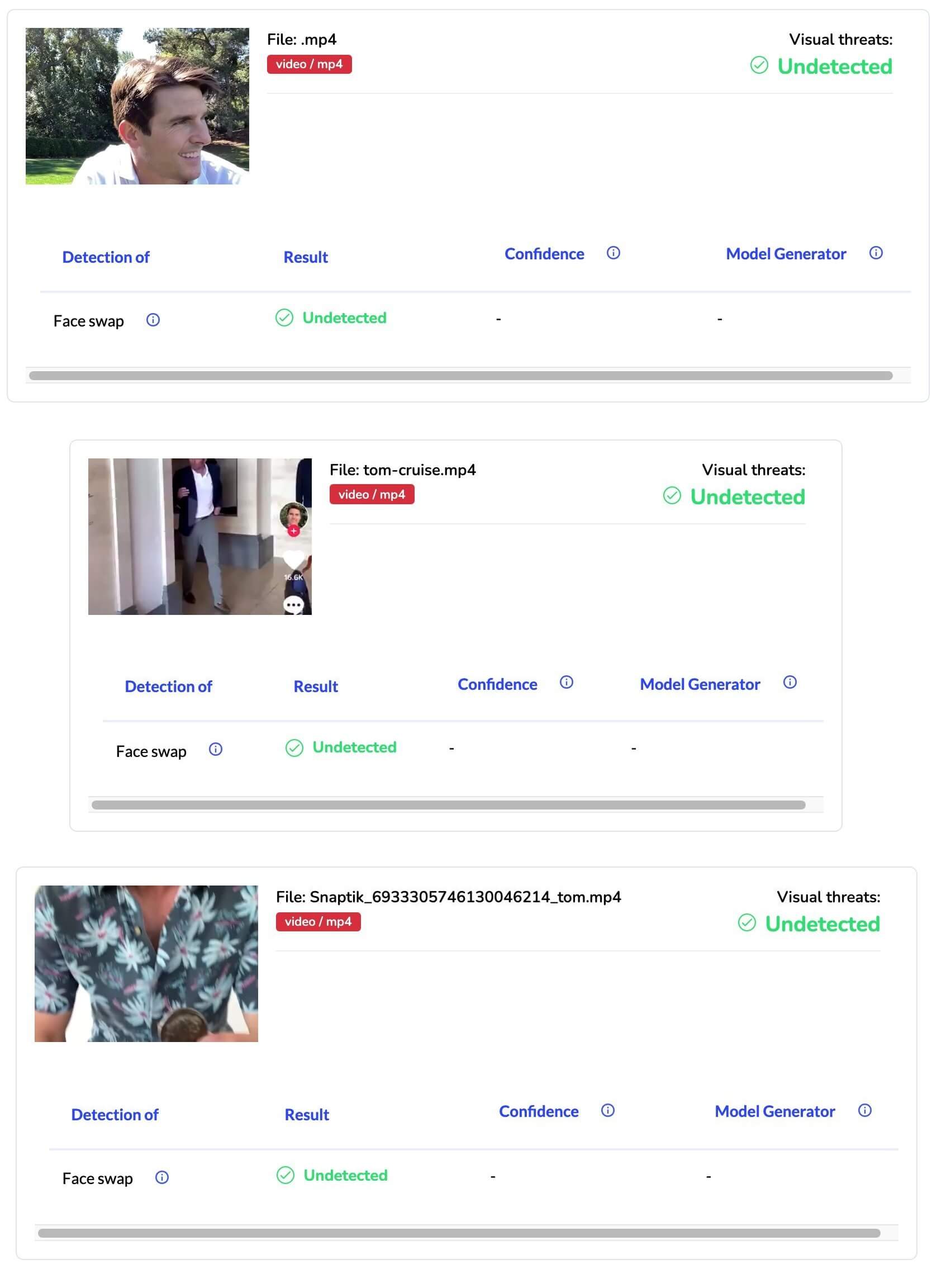 Videolar, Deepware ve Sensity adlı deepfake tespit platformlarının süzgecinden geçebilmişti (Öte yandan, http://counter.social adlı sosyal medya platformu bahse konu videolardaki deepfake yapıyı tespit ettiği iddia edilmişti).
