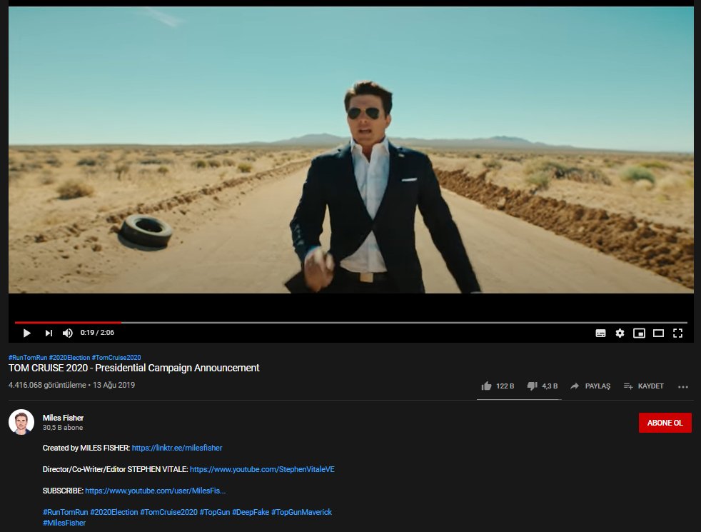 Kanye West’in ardından Tom Cruise’un da ABD başkanlığı için adaylığını koyduğunu duyurduğu sanılan video, Miles Fisher adlı ABD’li oyuncu tarafından hazırlanan bir (“deepfake”) parodi kayıttı.