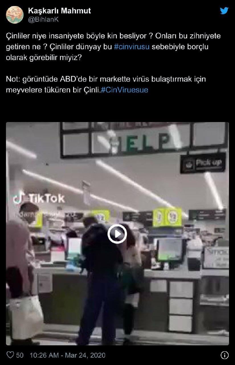 Videonun ABD’de bir markette başkalarına koronavirüs bulaştırmak için meyvelere tüküren bir Çinliye ait olduğu iddiası doğru değil. Video aslında 2 parçadan oluşuyor.