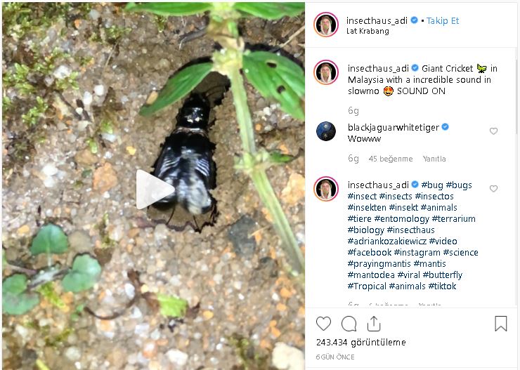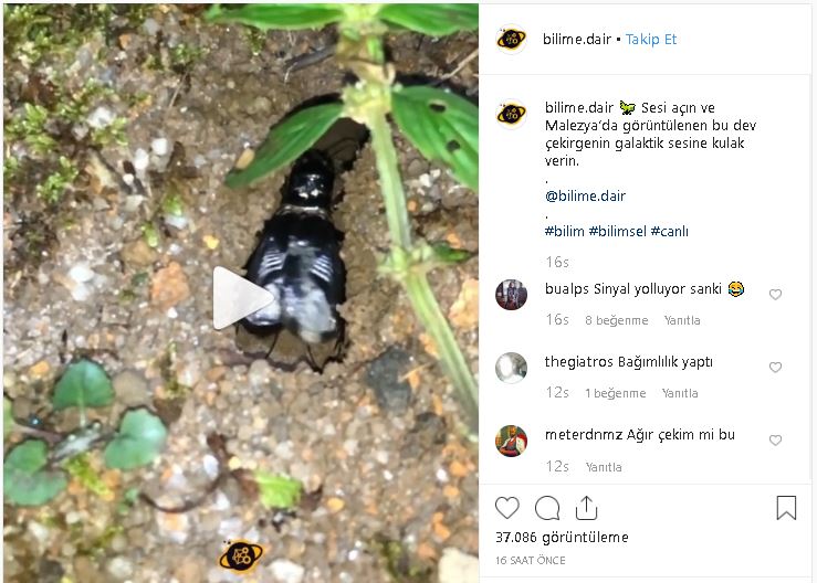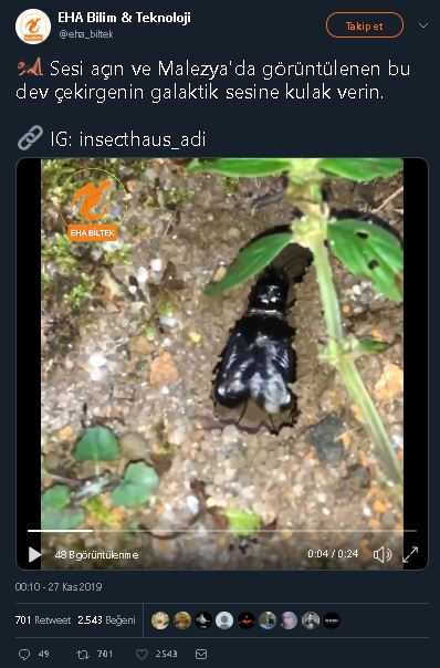 EHA Bilim & Teknoloji adlı Twitter hesabında “Sesi açın ve Malezya’da görüntülenen bu dev çekirgenin galaktik sesine kulak verin” notuyla paylaşılmasının ardından söz konusu videonun aynı açıklama ve içerikle Bilime.dair adlı Instagram profilinde de yayınlandığı görülüyor.