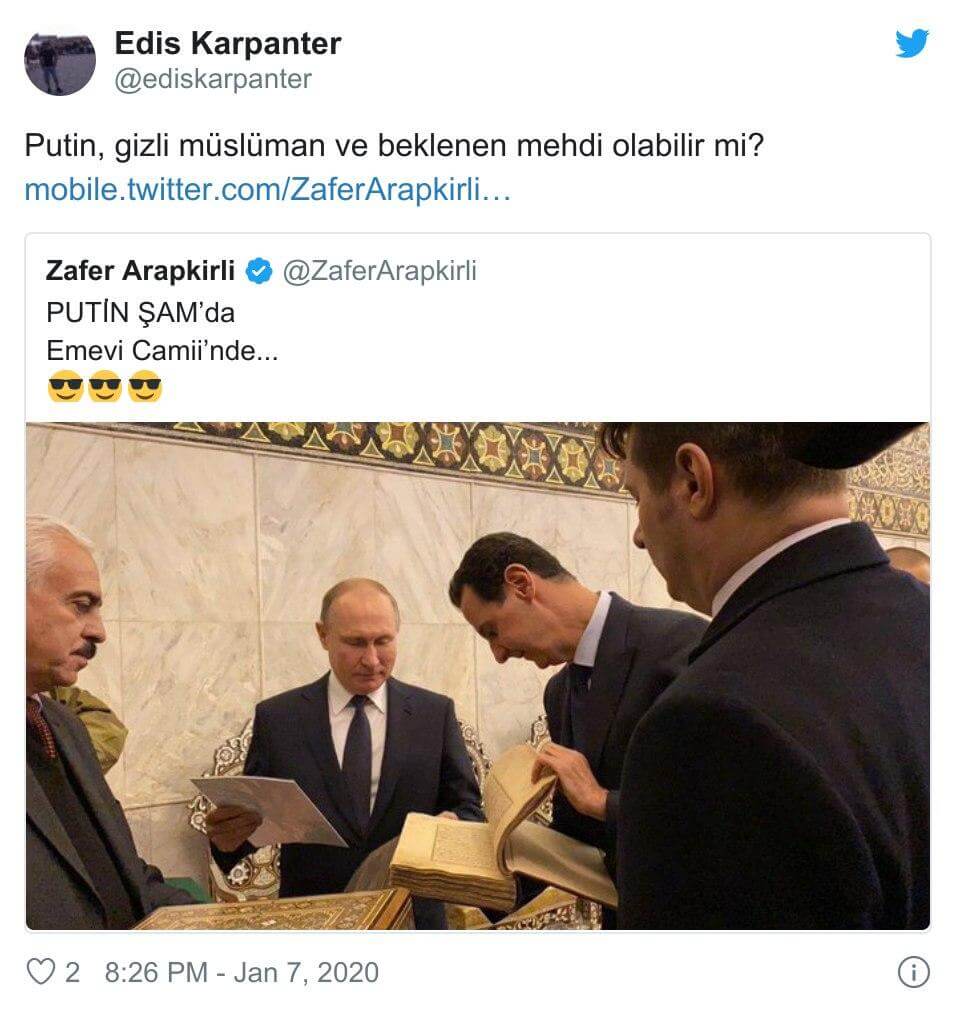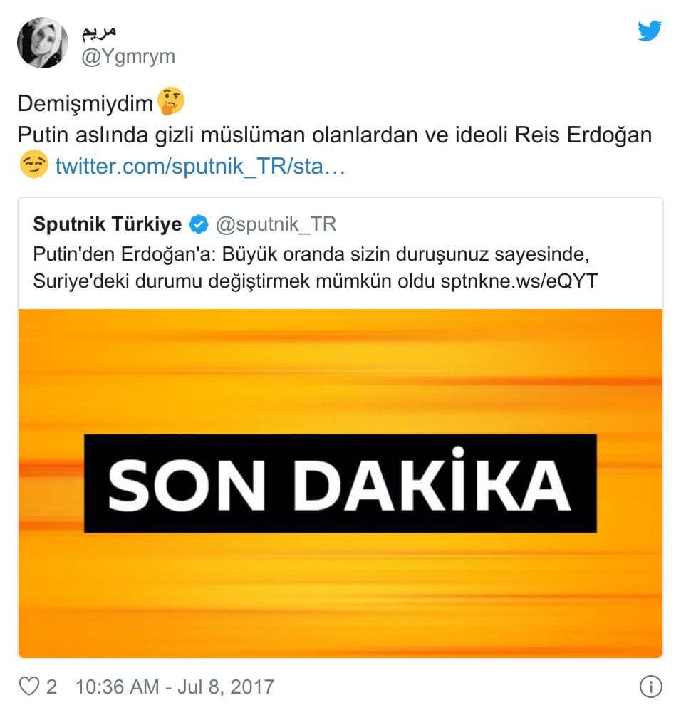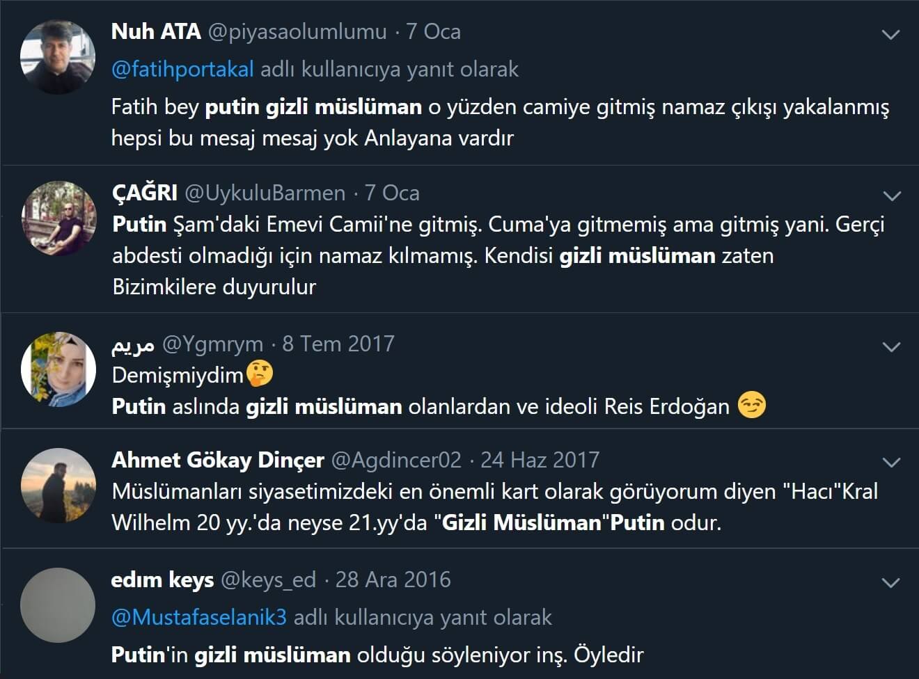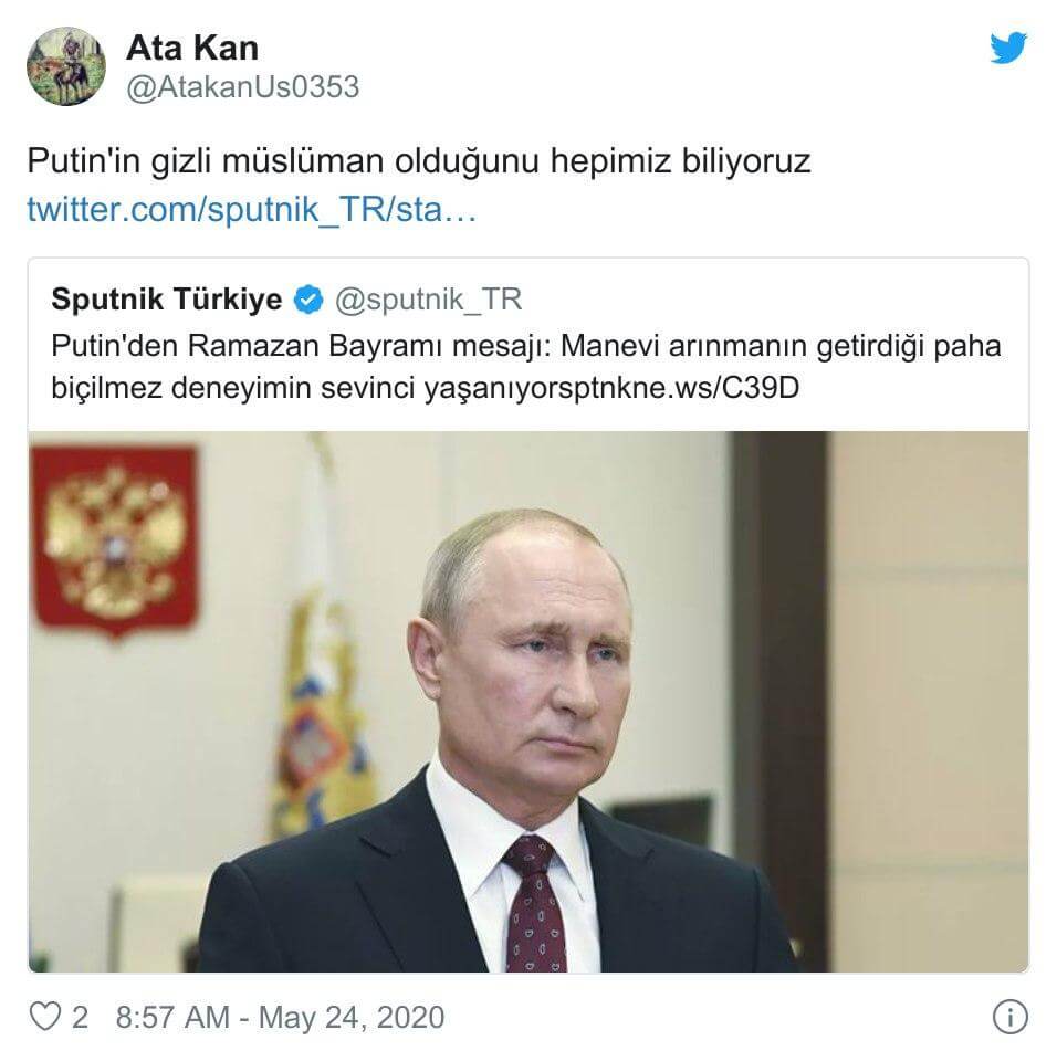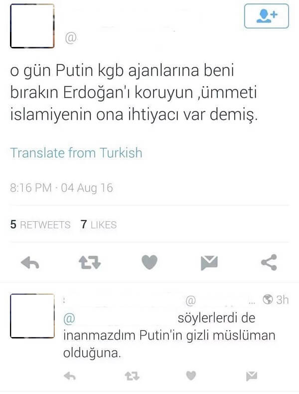 Hatta, Vladimir Putin’in Müslüman olduğu iddiasını KGB ajanlarına “Beni bırakın Erdoğan’ı koruyun, ümmeti islamiyenin ona ihtiyacı var” dediğini uydurarak öne süren (troll olup olmadığı teyit edilemeyen) profiller de mevcut (İlgili profil sahibinin yıllar sonra gelen talebi üzerine ismi ve cismi gizlenmiştir).