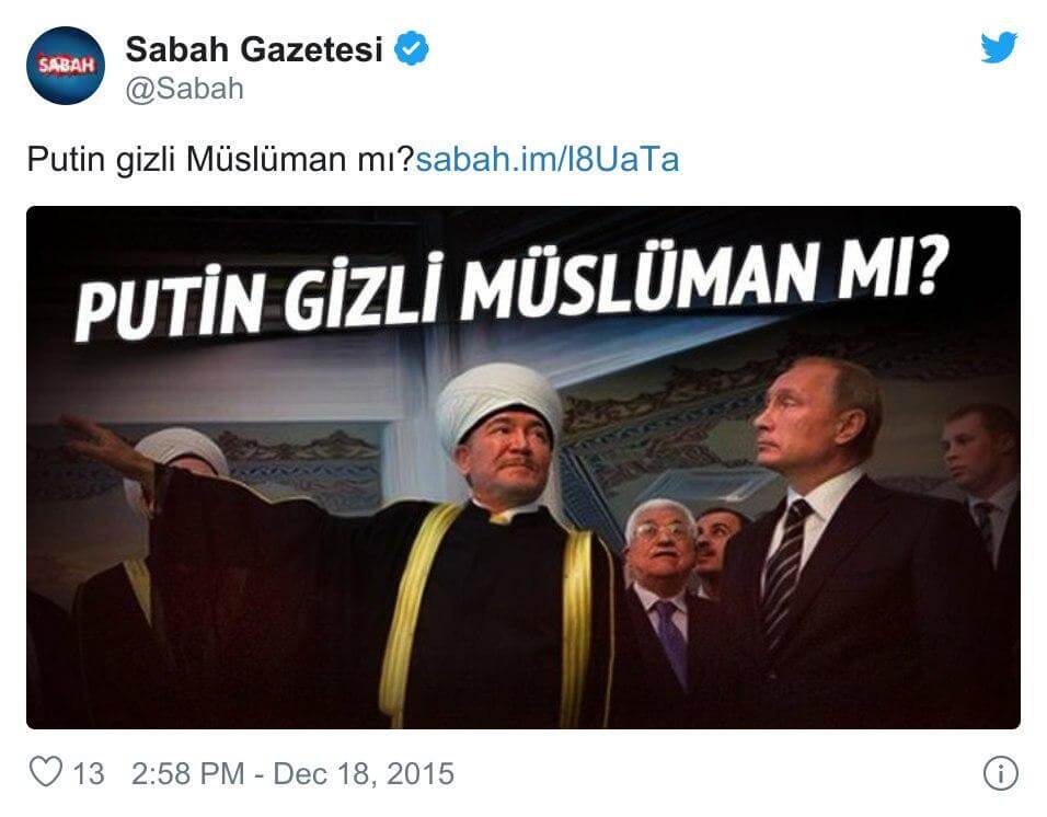 Ezcümle, asparagas olduğu fersah fersah öteden bariz olan iddiayı kaynağından doğrulamak yerine “tık” ve “fav” için yayımlayan haber siteleri ve sosyal medya kullanıcıları sayesinde Putin sadece Türkiye’de Müslüman olmuştu…