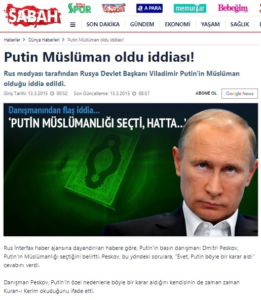 Vladimir Putin’in Müslüman olduğu iddiasını körükleyen bir gelişme ise 2015 yılı Mart ayında dolaşıma giren bir asparagas haberdi. “Rus medyası tarafından Rusya Devlet Başkanı Viladimir Putin’in Müslüman olduğu iddia edildi.” başlığıyla servis edilen haberin metni şu şekilde idi: