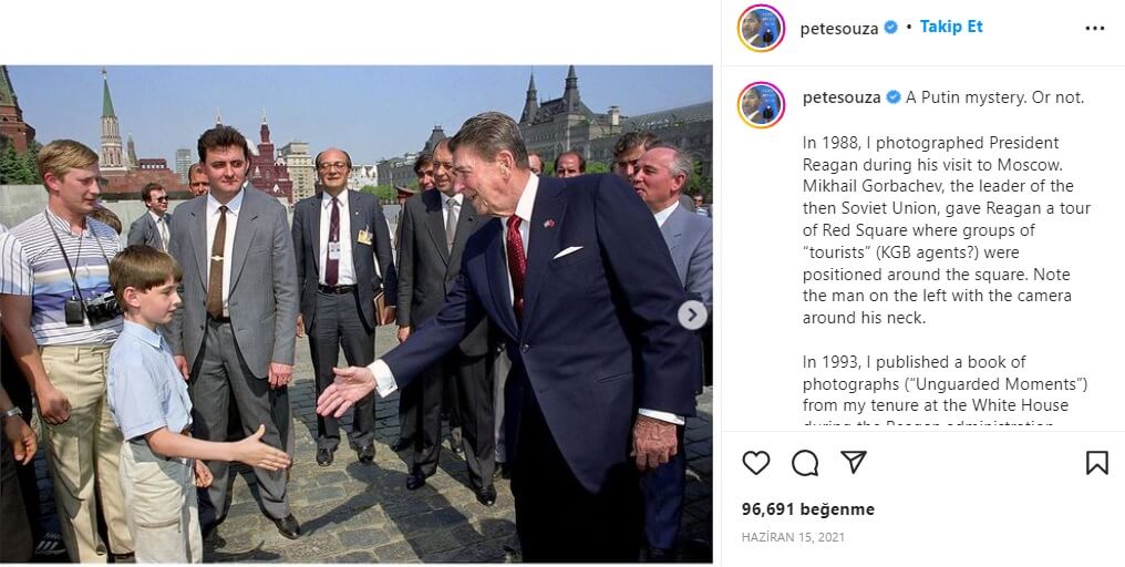 “A.B.D Başkanı Ronald Reagan’ın yakınlarındaki turistlerden biri tanıdık geliyor mu? Çocuğun hemen arkasında ve fotoğraf makinesi var. Aslında o bir KGB ajanı. Bugünlerde Rusya Federasyonu’nun başkanı olan şahıs Vladimir Putin. (1988)”