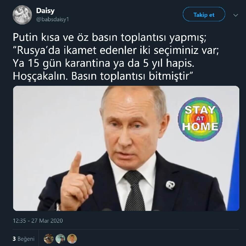 “Putin kısa ve öz basın toplantısı yapmış; “Rusya’da ikamet edenler iki seçiminiz var; Ya 15 gün karantina ya da 5 yıl hapis. Hoşçakalın. Basın toplantısı bitmiştir””