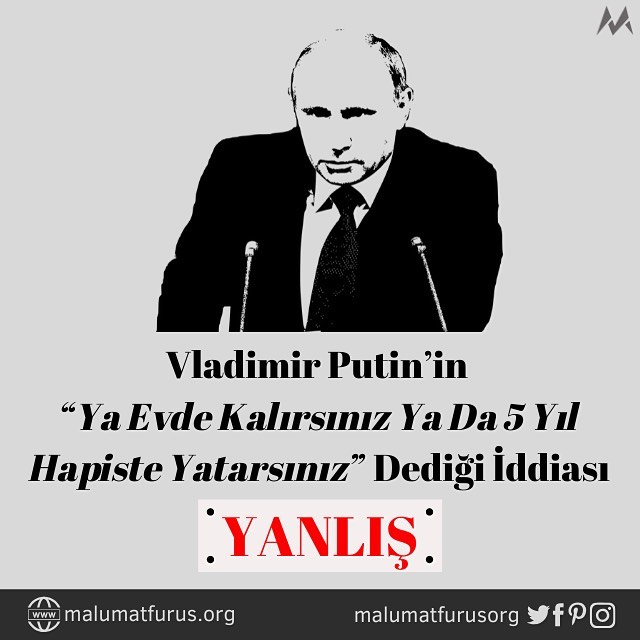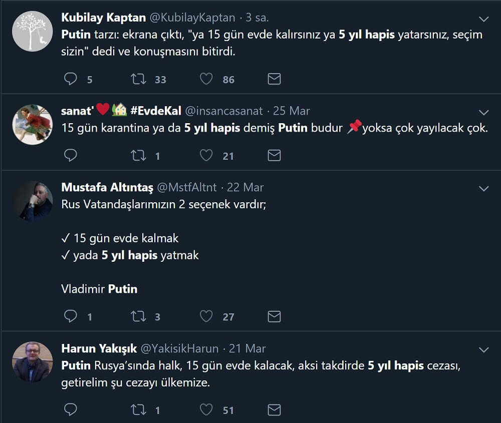 Vladimir Putin’in Rusya halkını evde kalmamaları durumunda 5 yıl hapis cezasıyla tehdit ettiği iddiasına dair sosyal medyada yapılan paylaşımlardan bazıları şöyleydi: