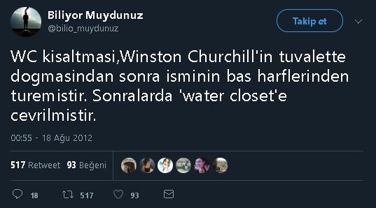 WC kısaltmasının Winston Churchill'in tuvalette doğmasından dolayı ad ve soyadından türetildiği iddiasını paylaşan tweet