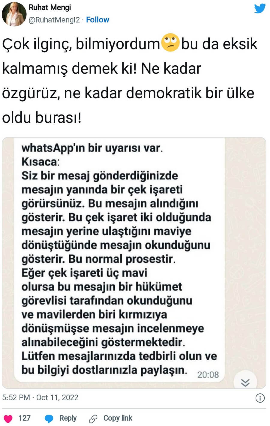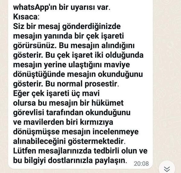 Eğer tik işareti üç mavi olursa bu mesajın bir hükümet görevlisi tarafından okunduğunu ve mavilerden biri kırmızıya dönüşmüşse mesajın incelenmeye alınabileceğini göstermektedir. Lütfen mesajlarınızda tedbirli olun ve bu bilgiyi dostlarınızla paylaşın.”